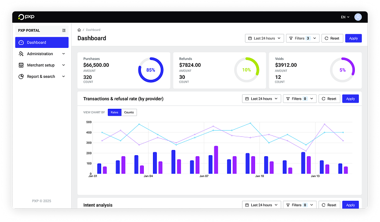 Full transparency over every transaction: refunds, authorisations, reporting—all available on-device or via your portal